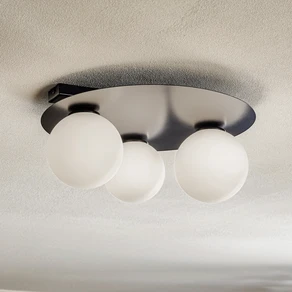 • de diskrete, enkle taklampene med en halvskallformet, kuppelformet, satinert skjerm i opalglass, som er perfekte for stuen eller soverommet takket være det varme, diffuse lyset