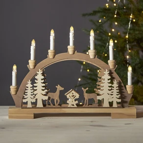 En trebue er en av de mest tradisjonelle og stemningsfulle formene for julebelysning. Naturmaterialets varme utseende skaper en koselig atmosfære som gjør seg spesielt godt i stuen, gangen eller i vinduskarmen. Med filigranhåndarbeid skapes små scener som forteller historier - av snødekte landskap, festlige landsbyer eller kjærlig utformede julekrybber.