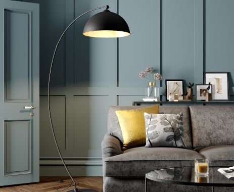 Direkte Beleuchtung des Sofas mit offener Bogenlampe.