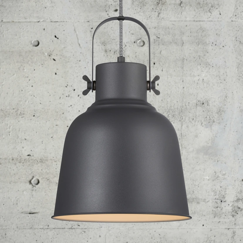 Opphengslampen Adrian ser robust ut og gir industriell sjarm til alle rom. Utstyrt med to tommelskruer, som lampeskjerm svinger i sin støttebjelke og kan festes i ønsket posisjon, kan lampens lyskegle rettes i ønsket retning. Et spesielt høydepunkt på lampen er lysutslipp gjennom skruene på siden.