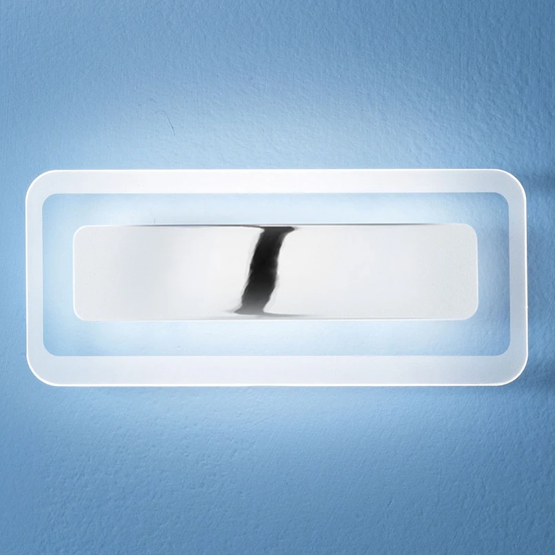 Moderne LED-vegglampe Antille med kromfinish Antille har en moderne rektangulær form med avrundede hjørner. Vegglampen kan også brukes som taklampe ved behov. Rammen og den sentrale delen er laget av hvitlakkert jern. Glassskjermen har en matt ytre sone som er laget ved hjelp av en sandblåsingsprosess. LED-lyskildene er plassert bak metallhuset, og Antille-vegglampen egner seg derfor perfekt til indirekte omgivelsesbelysning i moderne oppholdsrom.