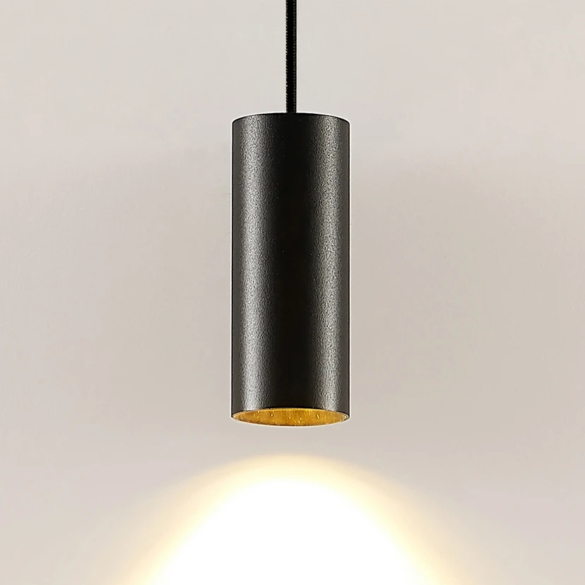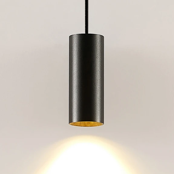 Smal Ejona pendellampe med svart finish og ekstra reflektorring i gull Ejona passer spesielt godt til moderne interiør. Pendellampen er rund, smal og har en lampeskjerm av ugjennomsiktig aluminium før den får en svart finish. Avhengig av valg av GU10-pære, som også fås med effektiv LED-teknologi, er lyset punktformet og hovedsakelig rettet nedover. Spesielt et diskområde kan bli godt opplyst på denne måten, spesielt hvis flere av lampene er plassert ved siden av hverandre med en viss avstand. For et mer individuelt utseende og et lysmønster med varme refleksjoner kan du bruke den ekstra reflektorpæren, som også er inkludert i leveringsomfanget og har en vakker gylden farge.