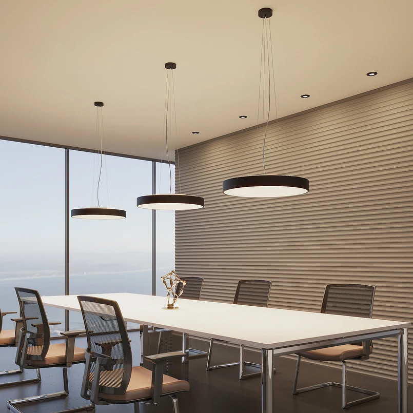 Svart LED-pendellampe Vanida i rund form Rammen på Vanida pendellampe er, i likhet med takfestet, laget av svarttonet aluminium, noe som skaper et uttrykk av kjølig eleganse. Skjermen suppleres av en skjermplate i hvit akryl, som sprer lyset mykere og jevnere, noe som forsterker armaturens koselige utseende. Lyset skinner ikke bare nedover, en liten del slipper også oppover, slik at lyset spotlighter rommet som et allroundlys og skaper en mer naturlig effekt. Takket være LED-teknologien garanterer pendellampen et sterkt lys med et relativt lavt forbruk, noe som er i tråd med moderne forventninger. Stålkabelopphenget fullfører det moderne uttrykket på en passende måte og gir Vanida et uttrykk av behagelig letthet.