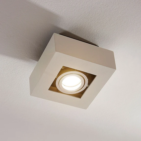 Hvit Vince-spotlight med GU10 LED-pot Denne ganske diskrete spotlighten kan brukes i mange forskjellige oppholdsrom og kan utstyres med en GU10-lyskilde. Den hvite rammen i metall og aluminium er ganske bred og hvitlakkert, noe som understreker spottens tidløse utseende ytterligere. Den innvendige lyskildeinnsatsen kan svinges.