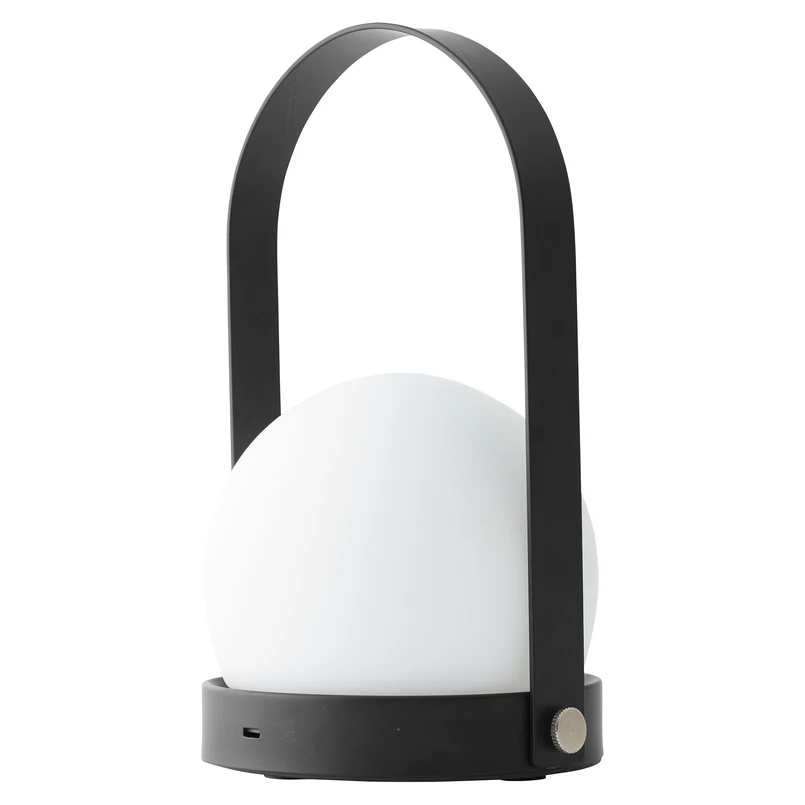 Carrie bærbar LED-bordlampe med USB-tilkobling og dimmer Den dekorative LED-lampen Carrie består av en sfærisk lampeskjerm og et beslag som er formet i en bue over lampen. Lampeskjermen er laget av munnblåst opalglass, som fungerer som en fantastisk diffusor og fordeler lyset jevnt og blendingsfritt i alle retninger. Rammen med brakett er laget av lakkert stål og er takket være sin utforming ideell for transport. Lampen har et integrert oppladbart batteri som kan gi lys i opptil 10 timer (avhengig av lysintensiteten under bruk). Batteriet kan lades ved hjelp av den medfølgende USB-ladekabelen. På innsiden av lampeskjermen er det montert lysdioder som kan dimmes i tre trinn ved å trykke på en knapp. Denne lille LED-lampen er derfor ikke bare funksjonsorientert, men gir også omgivelsene et varmt og beroligende lys. De danske designerne Jonas Bjerre-Poulsen og Kasper Rønn kombinerer moderne, minimalistisk design med den typiske danske "hygge"-stemningen. Inspirert av denne hyggen har Norm Architects skapt en armatur som representerer nettopp disse verdiene og samtidig passer sømløst inn i et moderne interiør. Resultatet av deres arbeid av høy kvalitet er en lyskilde som kan brukes på mange forskjellige måter, og som samtidig kombinerer estetikk og hygge.
