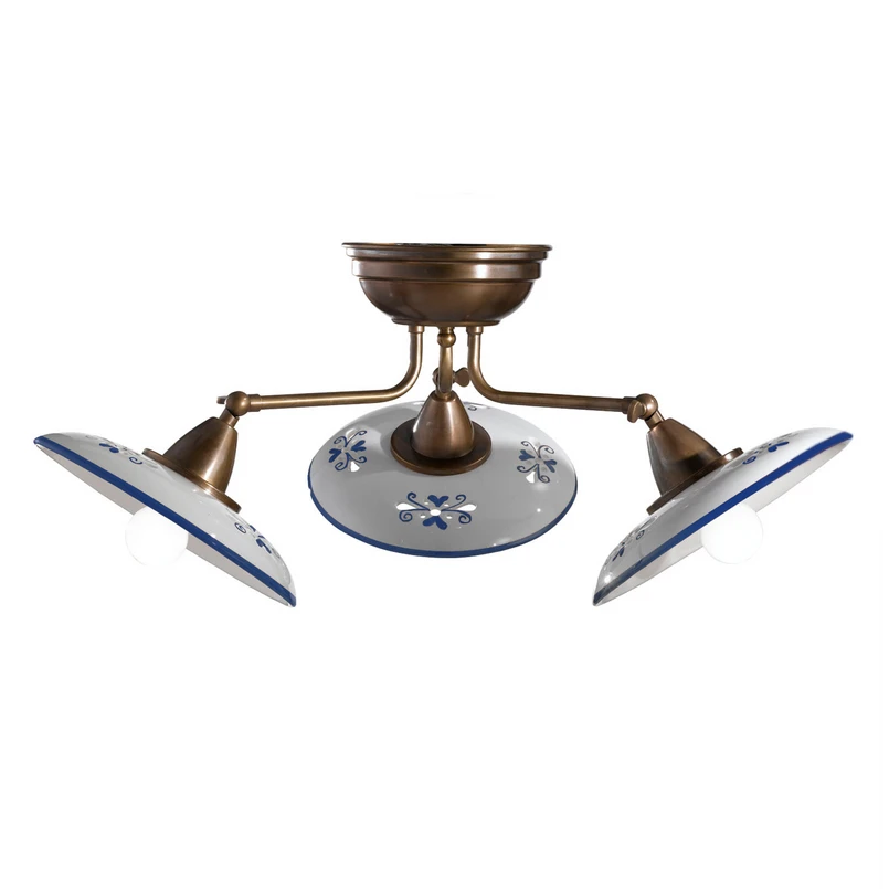 Bassano taklampe med tre lamper og vakre keramiske skjermerDen treflammers Bassano taklampen er et belysningsprodukt av førsteklasses kvalitet og utførelse, håndlaget i Italia. Bassano-lampens keramiske skjermer er malt for hånd. Lampens baldakin og armer er laget av messing og har fått en polert overflate som fremhever lampens landlige stil. Hver av de tre lampeskjermene kan justeres i helningen og festes i ønsket posisjon ved hjelp av et ledd med låseskrue, slik at selv store rom kan belyses perfekt med taklampen. Som belysning kan man bruke vanlige glødelamper på opptil 100 W, men også sparepærer og moderne LED-lamper som er spesielt effektive og har lang levetid. Taklampen ser også spesielt vakker ut med globelamper.