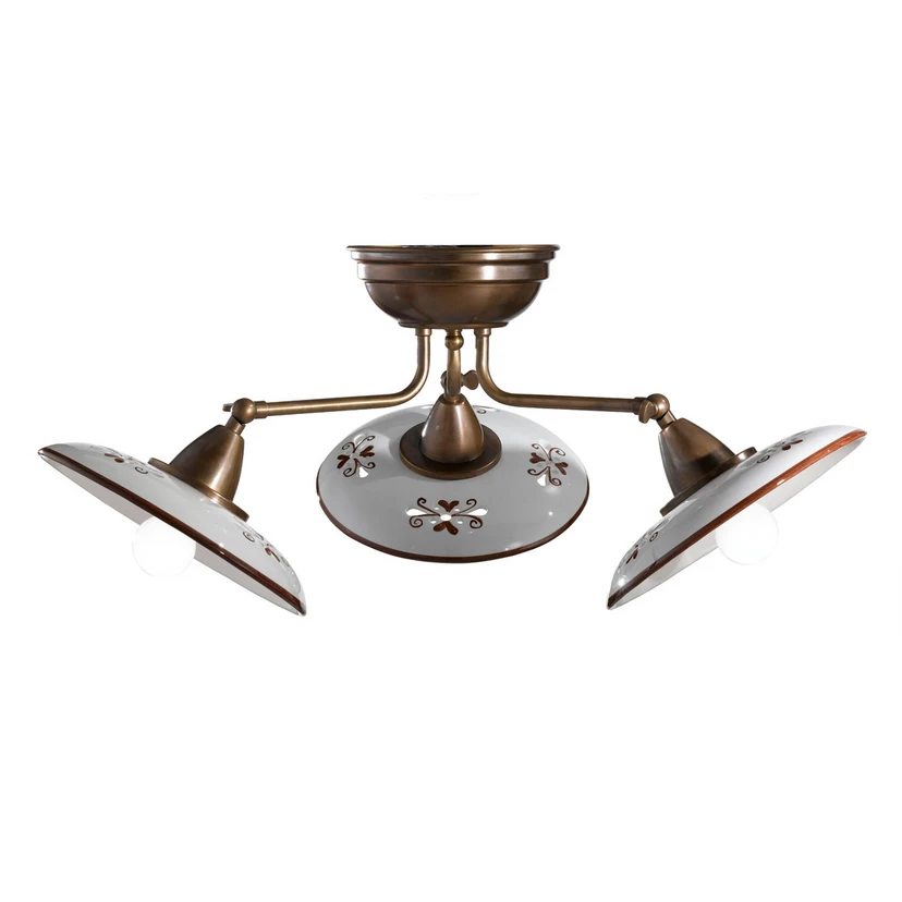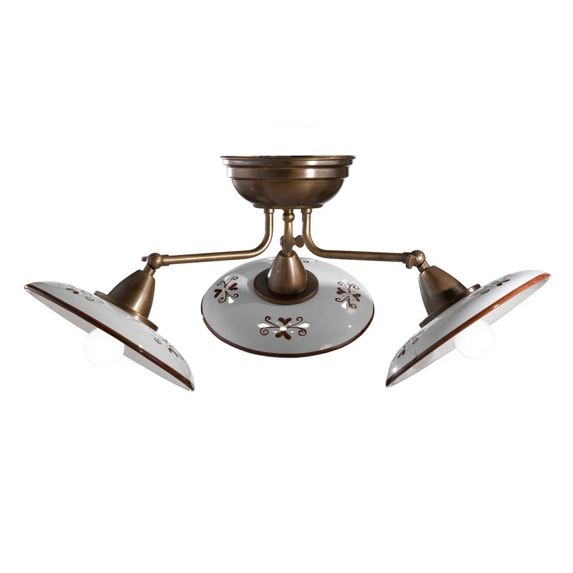 Bassano taklampe med tre lamper og vakre keramiske skjermerDen treflammers Bassano taklampen er et førsteklasses kvalitetsprodukt som er håndlaget i Italia. Bassano-lampens keramiske skjermer er malt for hånd. Lampens baldakin og armer er laget av messing og har fått en polert overflate som fremhever lampens landlige stil. Hver av de tre lampeskjermene kan justeres i helningen og festes i ønsket posisjon ved hjelp av et ledd med låseskrue, slik at selv store rom kan belyses perfekt med taklampen. Som belysning kan man bruke vanlige glødelamper på opptil 100 W, men også sparepærer og moderne LED-lamper som er spesielt effektive og har lang levetid. Taklampen ser også spesielt vakker ut med globelamper.