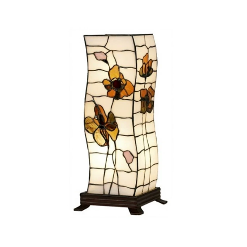 BLOSSOM - tiltalende bordlampe i Tiffany-stilDen rektangulære bordlampen BLOSSOM fortryller selv de mest forskjellige rom med sitt varme lys som trenger gjennom det mønstrede glasset. Den forseggjorte lampeskjermen minner om sarte blomster og ser svært elegant ut sammen med den mørke trefoten. En stilig bordlampe som gir en behagelig stil.bildet viser lampen i tent tilstand. Når lampen er slått av, ser glasskroppen (med unntak av blomstene) ut som perlemor.