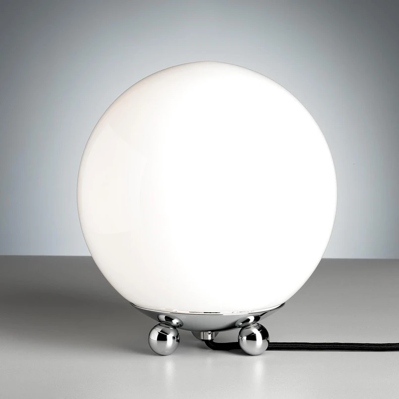 I tråd med Art Déco-stilen ble dette produktet utarbeidet som et vakkert formet buet opalglass-beger som hviler på en stav der foten er i forkrommet og forniklet metall. Materialene og opalglasskjermen gir fantastiske farger.