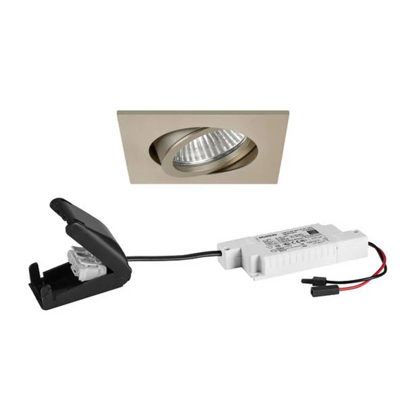 BB19 innfelt LED-armatur med RC-dimmer og koblingsboks Den innfelte downlighten BB19 med firkantet ramme leveres klar for tilkobling, inkludert LED-driver som kan dimmes via en ekstern RC-dimmer og koblingsboks. En spesiell egenskap ved denne spotlighten er dim-2-warm-funksjonen, som gjør at lysfargen endrer seg i takt med dimmeprosessen. Ved full lysstyrke er lysfargen 3 000 K, ved dimming synker lysfargen til 1 800 K. - dimbar med ekstern faseavsnittsdimmer - dim-2-warm-funksjon (3 000 K - 1 800 K) - sølvreflektor med rotasjonssymmetrisk, bredstrålende lysfordeling - avdekning av gjennomsiktig glass - tillatt omgivelsestemperatur -20 til 25 °C - med elektronisk forkoblingsutstyr, faseavsnittsdimmer - uten avdekning med varmeisolerende materiale - inkl. koblingsboks 3-polet for gjennomkobling