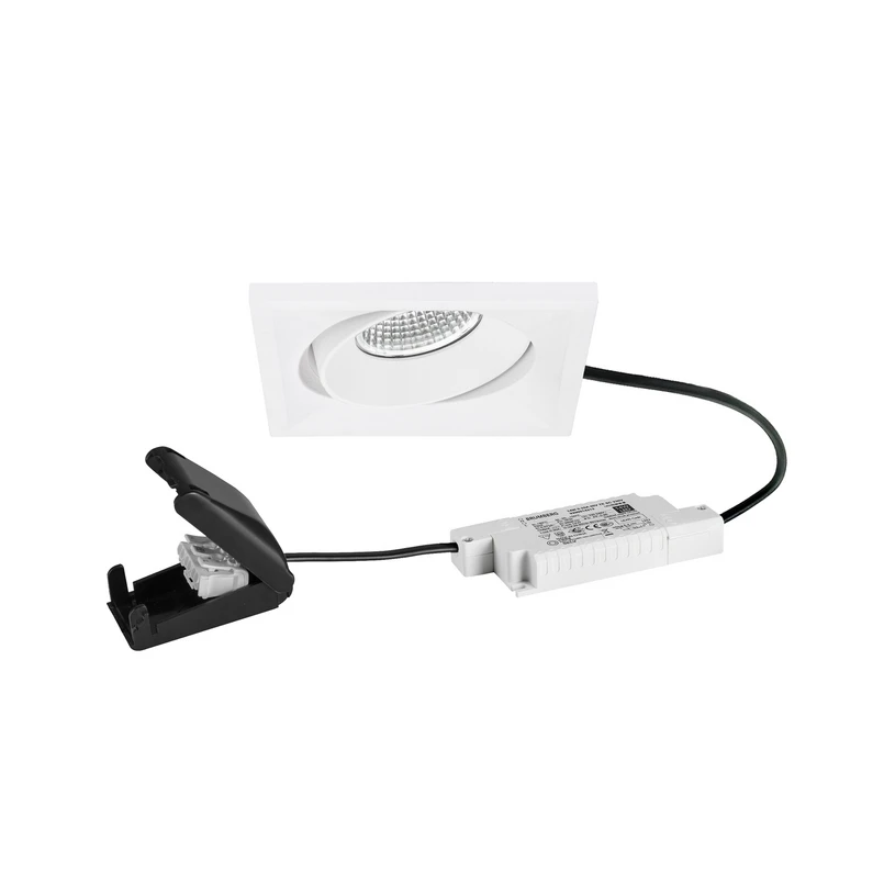 Innfelt LED-spotlight BB38 med dimbar LED-driver og koblingsboks Den kvadratiske innfelte LED-spotlighten BB38 leveres som et sett med en LED-driver som kan dimmes med en bakkantfasedimmer (RC) og en koblingsboks. Spotlighten kan svinges 20° i lysretningen og monteres i taket uten verktøy ved hjelp av monteringsfjærer. Høyt lysutbytte og optimal lysfordeling garanteres av den sølvfargede reflektoren med rotasjonssymmetrisk, smal og bredstrålende lysfordeling og det transparente polykarbonatdekselet - inkl. elektronisk forkoblingsenhet, bakkantfasedimbar - inkl. koblingsboks, 3-polet for gjennomkobling - tillatt omgivelsestemperatur (ta): -20 °C - +25 °C - spot kan svinges 20° rundt - maksimal taktykkelse 1,5 cm