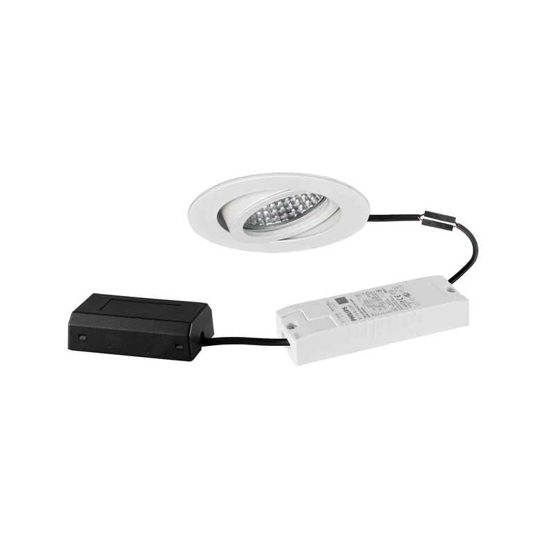 Tirrel-R innfelt LED-spotlight med DALI-dimbart ballast og tilkoblingsboks Den runde Tirrel R innfelte LED-spotlighten leveres som et sett med DALI-dimbart, elektronisk ballast og tilkoblingsboks. Den kan monteres i tak uten verktøy ved hjelp av monteringsfjærer, og kan svinges 20° slik at lysstrålen kan justeres etter behov. Den sølvfargede reflektorpæren med rotasjonssymmetrisk, smal bredstrålende lysfordeling og det transparente glassdekselet sørger for optimal lysfordeling og høyt lysutbytte, - Tillatt omgivelsestemperatur (ta): -20 °C - +25 °C - Beskyttelsesklasse (EN 61140): II, kapslingsgrad (DIN EN 60529): IP20 - med elektronisk ballast, DALI-2 dimbar - med tilkoblingsboks - uten synlig snapring