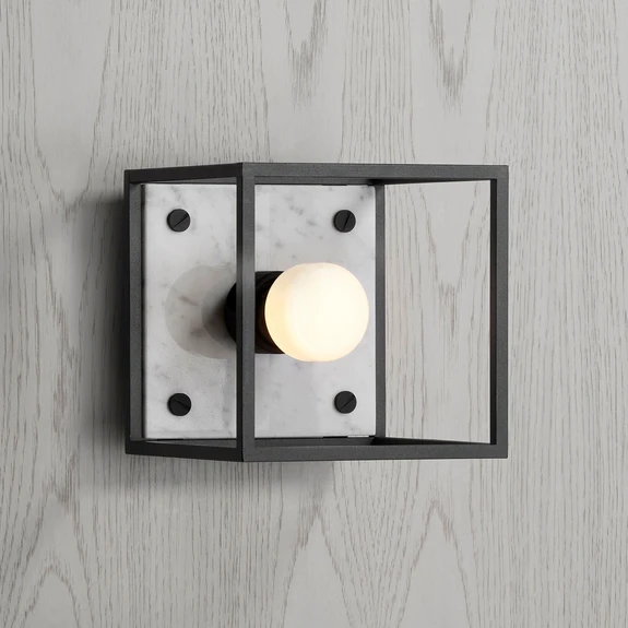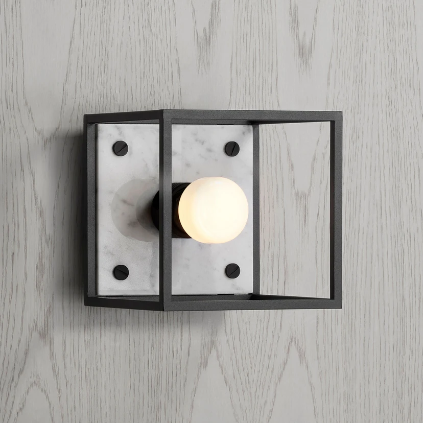Vegglampe Caged Wall small - åpen kube laget av metall med marmortopp