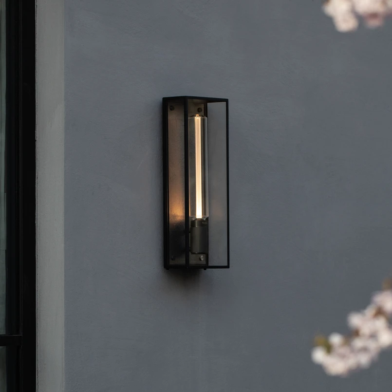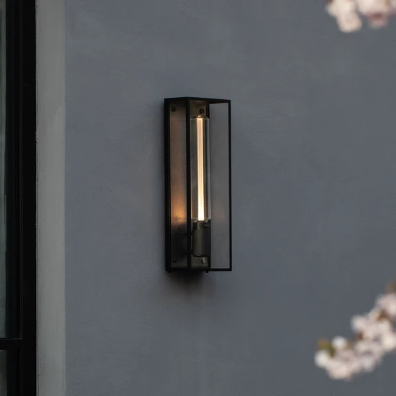 Caged Wet Stor design-vegglampe for utendørsarealer og baderom Denne vegglampen med bur består av et bur i matt svart metall og glass med en bakplate i støpt metall. Den har en solid metallsokkel med kryssriller og karakteristiske myntskruer. Armaturen har kapslingsgrad IP44, noe som betyr at den er egnet for fuktige rom, baderom og utendørs bruk. Takket være sandstøpeprosessen har bakplaten i metall en unik patinering, overflatestruktur og støpte merker som forteller historien om produksjonen og gir den karakter.