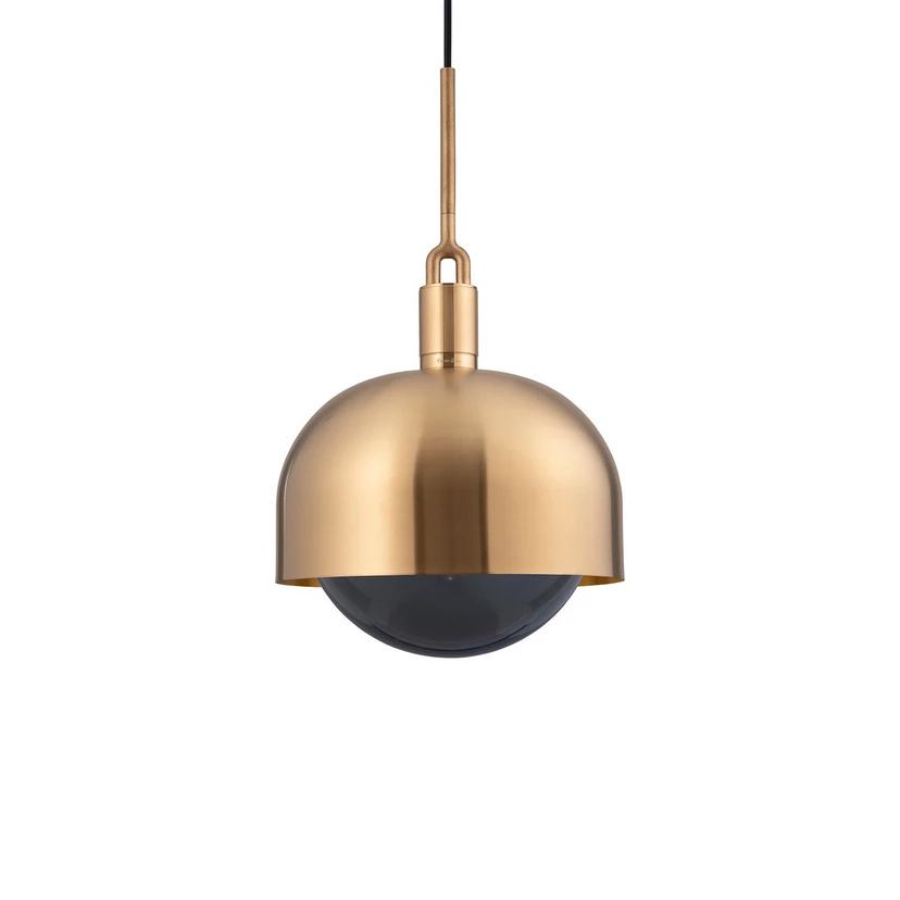 Skjermen til hengelampen Forked består av en munnblåst kule laget av røykfarget tonet glass og en skjerm laget av solid messing over den. Metallet ble delvis bearbeidet for hånd. Forked-pendellampen bærer også Buster + Punch-varemerket: det riflede mønsteret på lyssokkelen med etikettens skrift. Produsentens kjærlighet til solide metaller gjenspeiles også i denne pendellampen. I tillegg til lys lager Buster + Punch også beslag og innredning av disse materialene. En LED-lampe med E27-sokkel og varmhvit lysfarge er inkludert. Den avgir lyset veldig komfortabelt gjennom det røykfargede glasset og lysstyrken kan også reguleres med en dimmer som passer for LED-lamper. Forked er en pendel som ikke bare skaper en vakker atmosfære i private rom, men også utfolder sin effekt på hoteller eller gastronomiske områder.