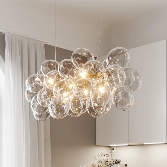 Ekstravagant Gross pendellampe - bestående av 38 glasskuler Hvis du vil skape et absolutt blikkfang midt i rommet ved å henge den opp i taket, vil Gross pendellampe helt sikkert treffe blink. Pendellampen består av 38 individuelle glasskuler, som danner lampeskjermen for de åtte G9-pærene i et tilsynelatende tilfeldig arrangement. Fra innsiden avgir pærene sitt strålende og glitrende lys til utsiden på grunn av den blanke overflaten på glasskulene. Passer i stuer og soverom, men også i prestisjefylte offentlige rom.
