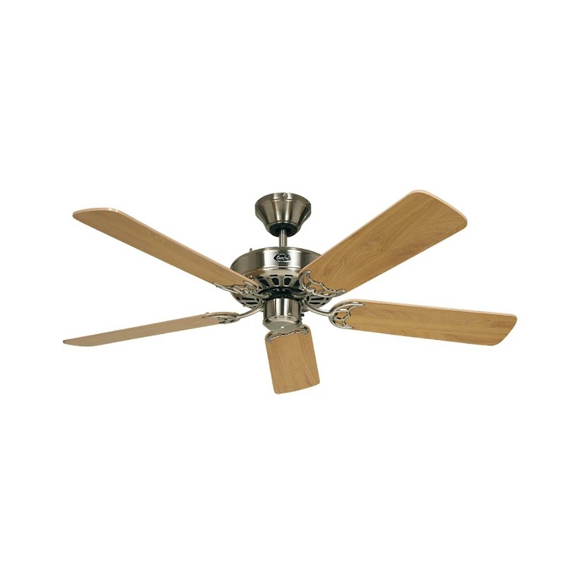 Denne takviften kommer i klassisk optikk i brun-antikk metallkasse med blader i bøketre og ensidig rattaninnlegg. Omdreiningstallet kan innstilles med en tretrinns takbryter. En skyvebryter gjør det mulig å stille om fra sommer- til vinterfunksjon. Denne ventilatoren er i alle fall et vakkert accessoire til et stort ambiente. Egnet til rom opp til 25 m².