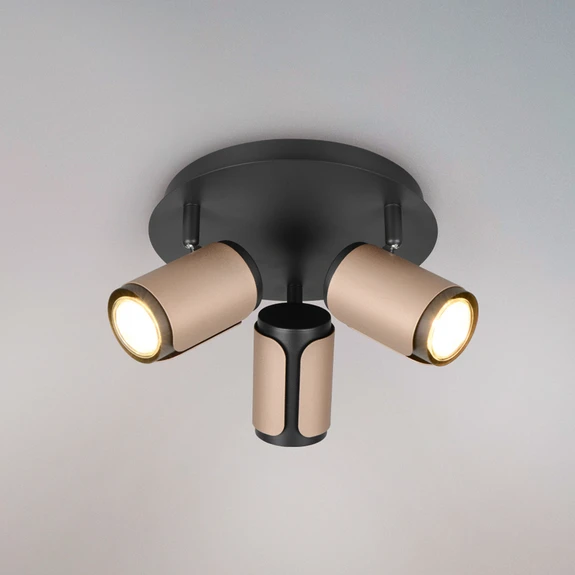 Den runde downlight Gillan overbeviser med sin moderne design i metall. De kaffebrune skjermene på de tre spotene, som sitter på den runde baldakinen, gir spotlighten en viss raffinement og en tidløs eleganse. Spotlighten er utstyrt med GU10-fatninger, som kan utstyres med GU10-pærer opp til 10 W (LED).