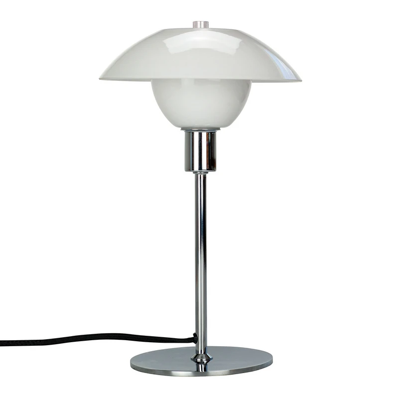 Kombinasjonen av hvitt opalglass og krommetall gjør bordlampe Bergen til en edel skinnende lyskilde av en spesiell type.Det spesielle arrangementet av de to skjermelementene, et mindre, som er justert på fatning opp og lampen er skjult og en større, buet tallerken, som sitter i motsatt retning med en liten avstand over, skaper en imponerende og helt blendingfri lyseffekt. bordlampe Bergen ble utviklet og produsert av det danske lysfirmaet Dyberg Larsen.