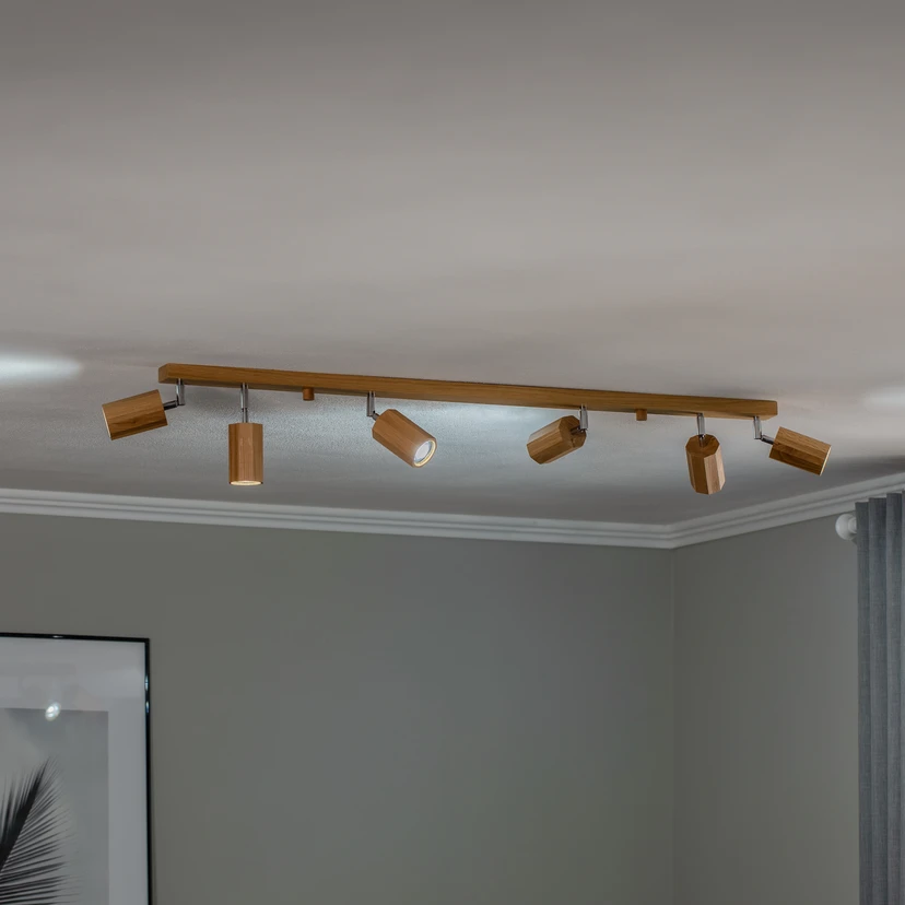 Peach Puff takspotlight med seks lyskilder i lyst tre i en åttekantet form Peach Puff takspotlight i tre, produsert i Europa, er en fleksibelt justerbar lyskilde med naturlig utstråling for tørre innendørsområder. De seks avlange hodene med åttekantet base er plassert under en rektangulær baldakin og har en rund åpning på undersiden som er dimensjonert for en 5 cm Ø og 5,6 cm lang lyskilde.