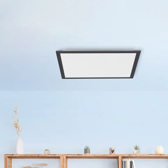 Den firkantede LED-taklampe Flat har en svart ramme som omgir plastdiffusoren. Takket være overflaten sendes et homogent, blendfritt lys nedover. Den moderne, enkle designen sørger for at Flat kan integreres i nesten alle rom.