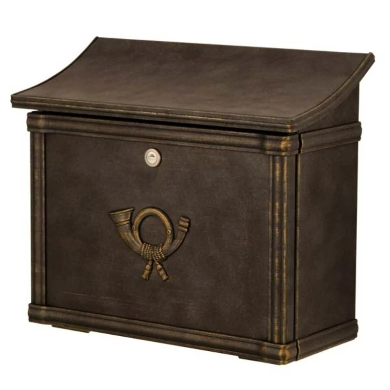 Rustikk Merito-brevkasse i pulverlakkert rustfritt stålMerito-brevkassen med C4-spalte på tvers kommer fra et tradisjonsrikt verksted i Midt-Franken - og det kan du se og føle. Materialet består utelukkende av rustfritt stål og er patinert for hånd i gull og brunt. For å beskytte det mot vær og vind ble dette effektfulle fargelaget dekket med en klar lakk. Et annet høydepunkt er det klassiske stolpehornet midt på fronten. To sikkerhetsnøkler, alt nødvendig festemateriell og et navneskilt i messing som kan graveres, er selvfølgelig inkludert i leveransen.