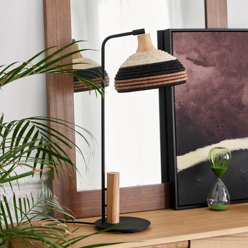 Den spesielle, håndlagde skjermen til Grass bordlampen sitter på en svart metallramme med dekorative tredetaljer. Flettet for hånd er denne paraplyen laget av abacá, en plantefiber som kommer fra den indre delen av abacá-treet og er kjent for sin høye strekkfasthet og holdbarhet, og det er derfor denne fiberen også brukes til å lage tau til skip, for f.eks. eksempel. En annen komponent i paraplyen er raffia, en fiber som trekkes ut for hånd fra de uåpnede bladene til den afrikanske raffiapalmen, også kjent som buripalmen. Varme fargekombinasjoner i stripet design gjør bordlampen til en lyskilde som gir komfort og naturlighet til ethvert rom.