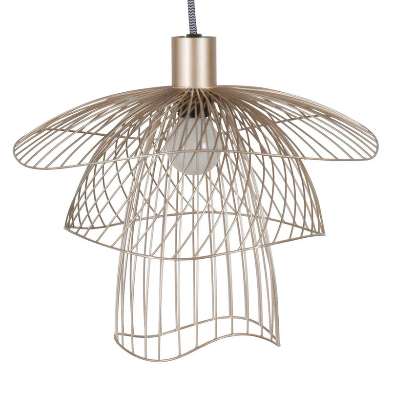 Poetisk design av lys og skygge - pendellampen Papillon av Élise FouinÉlise Fouin er en ung designer som setter materialet i forgrunnen. Hun bruker resirkulerte materialer som råstoff for å gjenoppfinne dem. Arbeidet hennes er preget av en poetisk ånd og et engasjement for bærekraftig utvikling. Papillon består av tre kupler i ulike størrelser som er plassert over hverandre. De mange metalltrådene filtrerer lyset og sørger for et unikt lys- og skyggespill på veggen. De bølgede kantene på kuplene minner om 50-tallets geometriske design og virker svært lette og svevende på grunn av armaturhusets luftige utforming. Armaturen kompletteres av en tekstilkledd kabel som ender i en rund takbaldakin i armaturens farge.