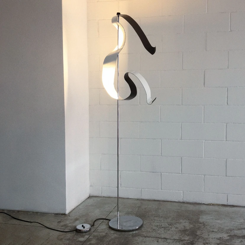 Vakkert blikkfang for dine egne fire veggerGulvlampen Curve LED tilbyr noe som definitivt ikke er hverdagskost: Armaturen, som er laget av aluminium, har en lampeskjerm som er helt dekket med bladsølv på den ene siden og en dypsvart kontrast på den andre. Innvendig arbeider energibesparende lysdioder med et varmhvitt lys som lyser opp den sølvfargede siden og dermed gir en spesiell lyseffekt. En integrert spesialbryter sørger for at de to elementene kan slås av og på uavhengig av hverandre. Designerlampen er produsert i Italia, der den er håndlaget med største omhu.