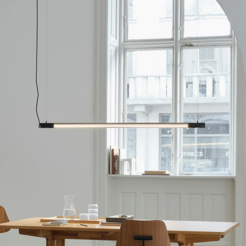 GEJST Radent hengelampe kombinerer minimalistisk design med funksjonell belysning. Den er laget av perforert stål og designet av Rune Krøjgaard, og overbeviser med sitt klare formspråk og høye kvalitet. Den svarte overflaten gir lampen en tidløs eleganse som passer perfekt inn i ulike oppholdsrom som arbeidsrom, spisestue, kjøkken eller stue.