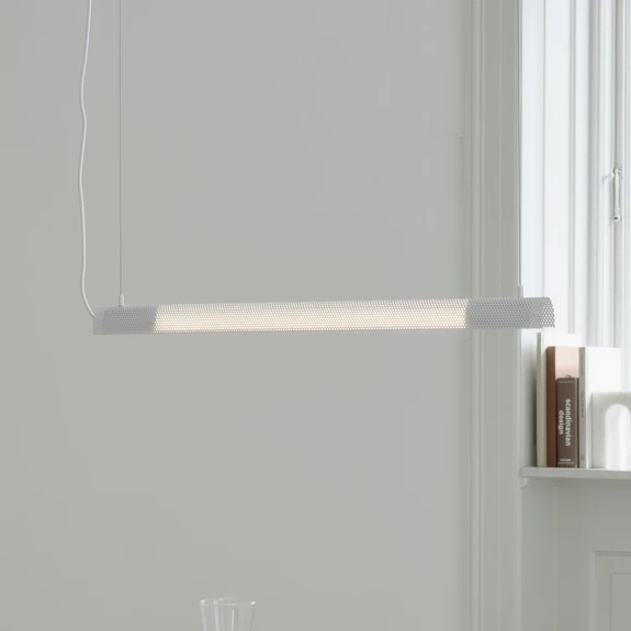 GEJST Radent hengelampe overbeviser med sitt minimalistiske design og høykvalitets utførelse i perforert stål. Den klare, hvite fargen harmonerer med de mest forskjellige innredningsstiler og setter et elegant preg på ethvert rom. Den varmhvite lysfargen på 3000 K skaper en behagelig atmosfære som passer både til avslappende oppholdsrom og produktive arbeidsmiljøer.