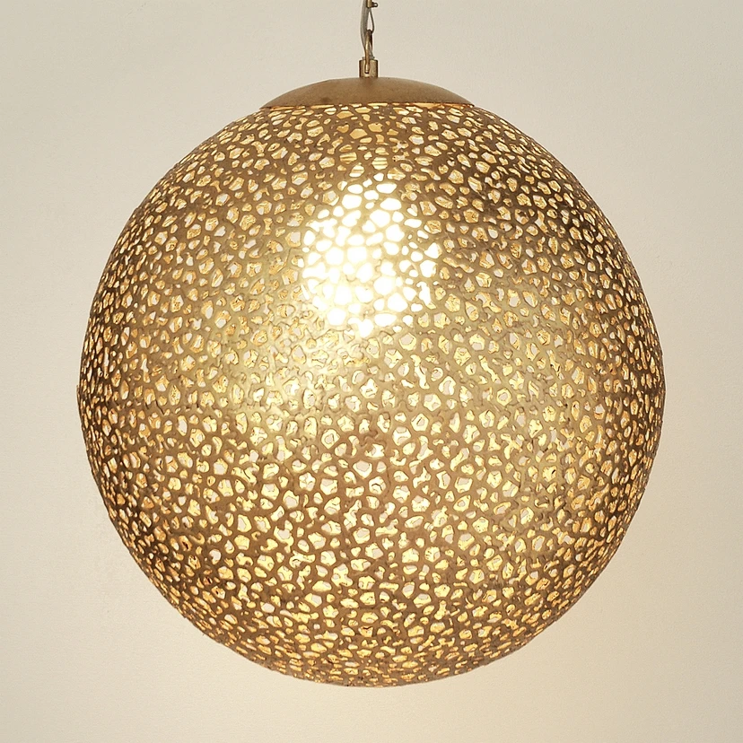 Hengelampen UTOPISTICO er et ekte blikkfang som kan benyttes for å iscenesette og lyse opp de forskjelligste rom: Den kuleformede, store lampen i gullfarget jern er utsmykket med et filigranmønster, som lyset kan skinne uhindret gjennom. Mønsteret gir attraktive lyseffekter i omgivelsene.