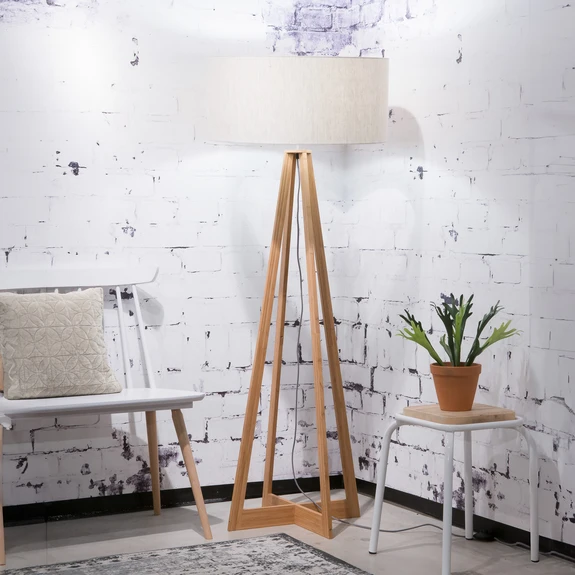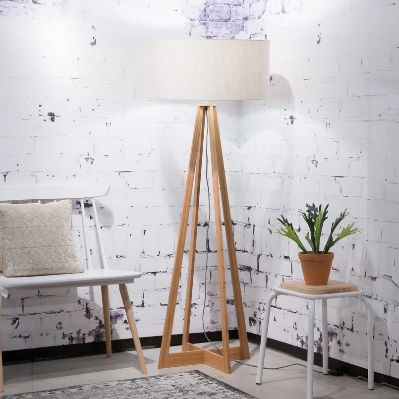 Good & Mojo Everest gulvlampe med interessant fot Everest gulvlampe, med sitt lyse lindeksel og imponerende høyde, er en stilfull designbelysning til stuen eller soverommet. Fire trespiler løper sammen i bunnen og danner en kantet, stabil base. Denne gulvlampen kombinerer estetikk med funksjonalitet og skaper en atmosfære som innbyr til å slappe av. Bruken av bærekraftige materialer og miljøbevisst emballasje understreker Good & Mojos engasjement for ansvarlig design. Med sin klare og tidløse stil føyer gulvlampen seg sømløst inn i ulike møbleringskonsepter og blir et blikkfang i ethvert rom. Hver gang du kjøper en lampe, plantes det et tre.