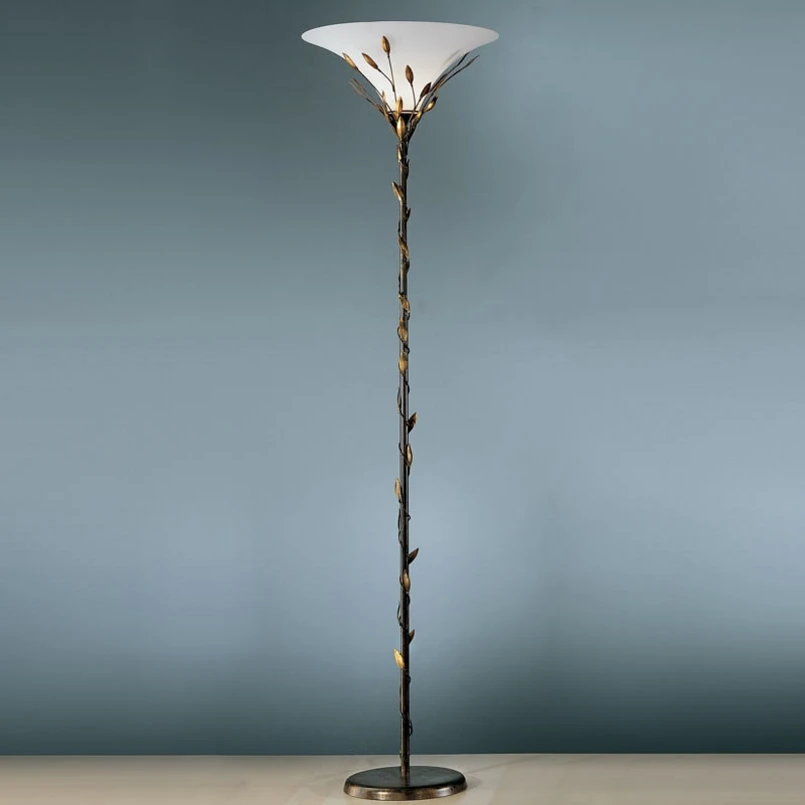 Dekorativ Campana-gulvlampe med bladapplikasjoner Campana-gulvlampen skiller seg ut med sin vakkert dekorerte kappe av gylne blader. Disse slynger seg elegant rundt metallrammen i rustbrun og gammelgullfinish og ender i lampeskjermen. Denne er laget av satinert glass i form av en skål som er åpen i toppen, og sender lyset fra E27-pæren (75 til 100 W - eksklusivt) mot taket som en lyskaster. Utstyrt med dimmerbryter på støpselkabelen.