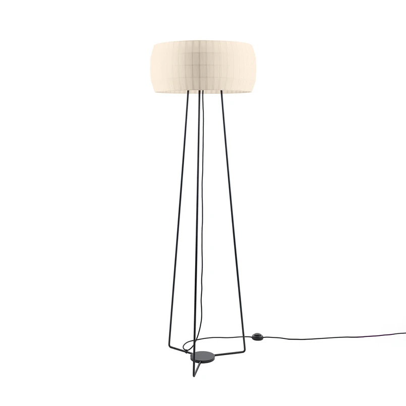 Isamu appellerer som en tidløs, koselig lyskilde for oppholds- og salongområder. Lampeserien er et design av Nahtrang, et spansk designstudio grunnlagt av Daniel Vila og Ester Pujol. Gulvlampen er utstyrt med en sort metallramme, som består av en flat, rund sokkel og et slankt stativ. Sistnevnte bærer den karakteristiske lampeskjermen til Isamu-serien, hvis vertikalt åpne struktur er vevd med et meget fint, silkelignende polyestertekstil i perlehvitt, som lar lyset skinne diskret gjennom. Den betjenes med fotbryteren på støpselkabelen.