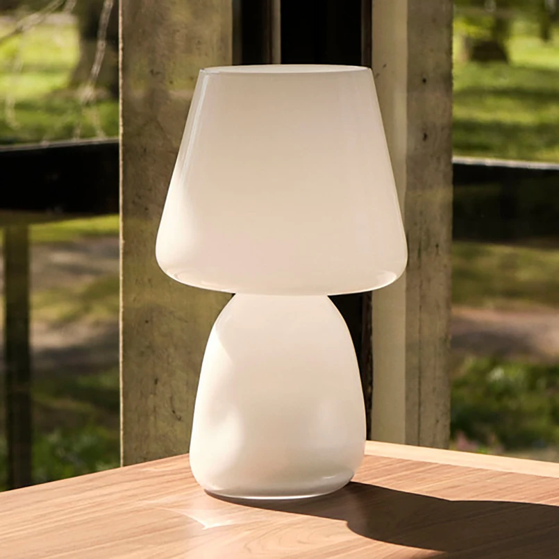 Apollo er håndlaget av håndblåst opalglass, basen inkludert kabel, plugg og bryter er plassert i lampeskjermen og festet med en kork.