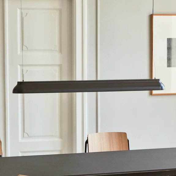 PC Linear LED-pendellampen er det siste tilskuddet til Pierre Charpins PC-familie av lys og deler den samme enkle og elegante designen som denne lysfamilien. Den lange skyggen er laget av et enkelt stykke aluminium med en våt sprayfinish. Den lange formen på skjermen gjør lampen til den ideelle lyskilden over lange bord i spisestuen eller i møterom eller over utstillingsbord og hyller i kommersielle rom. Den progressive, teknologisk avanserte lampen er utstyrt med varmhvite LED-er, hvis lys spres gjennom polykarbonat-diffusoren og lyser opp den underliggende overflaten uten gjenskinn og jevnt. De innebygde LED-ene kan dimmes ved hjelp av en ekstern dimmer (Triac).