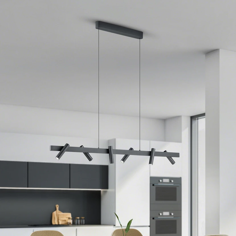 Coni LED-stangpendel i svart med seks justerbare spots Coni LED-stangpendel med varmhvite LED-lamper med svært god fargegjengivelse (CRI 90) gir en behagelig belysning av høy kvalitet. Lyskildene er plassert i seks justerbare, sylindriske spotter på aluminiumsstangen, slik at de kan justeres etter behov - perfekt for lange spisebord, kjøkkenbenker eller hotelldisker. I bjelken er det også integrert en smal lyslist for indirekte belysning i taket. Med sin mattsvarte finish og klare former er Coni det ideelle valget for moderne møbleringskonsepter - kan dimmes eksternt via fasestyring i forkant/bakkant