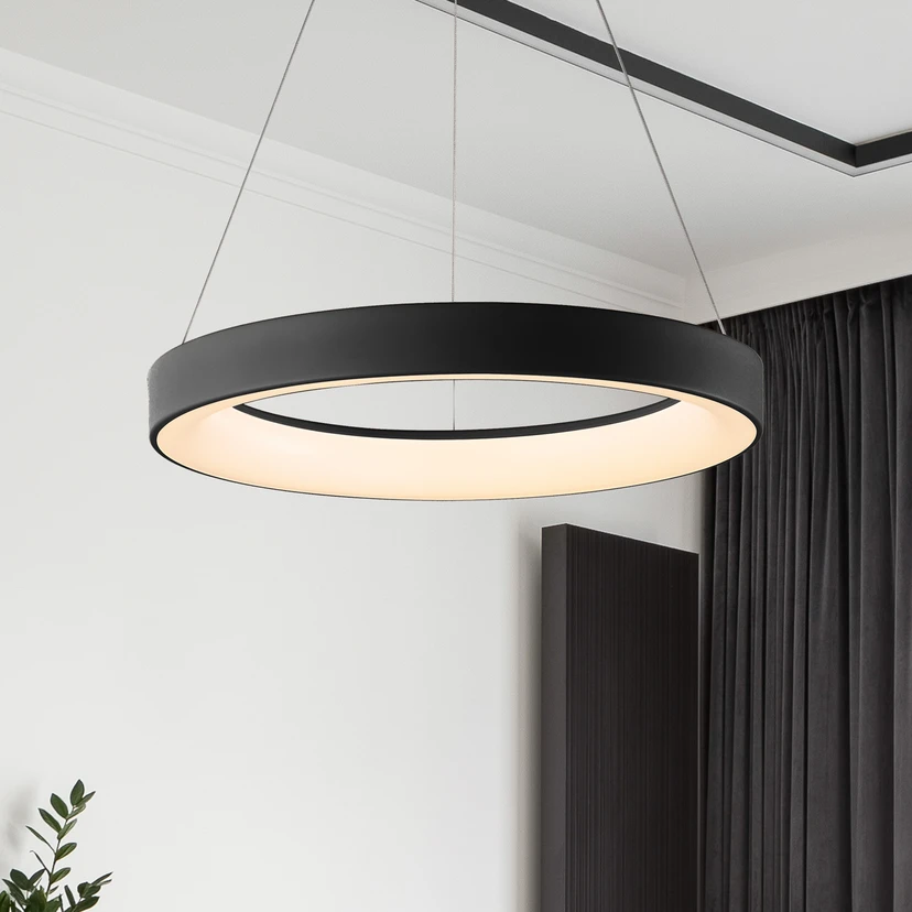 Niseko II LED-pendellampe med CCT-lysstyring og fjernkontroll Skjermen på Niseko II LED-pendellampen er formet som en ring. Den henger fra den runde baldakinen på tre kabler og har et satengsatt akryldeksel på innsiden, som lyset fra de innebygde LED-lampene sendes ut homogent gjennom. Armaturen leveres med fjernkontroll og gir fleksibilitet i belysningen, ettersom lyset kan velges fra varmhvit til universalhvit og dimmes trinnløst takket være CCT-lysstyring. Alternativt kan lyset styres via smarttelefonen ved hjelp av den gratis Mantra-appen som er tilgjengelig for Android og iOS. Hengelampen er en fleksibel lyskilde for spisebordet, stuen eller kjøkkenet, og den kjennetegnes av lang levetid og høy lang holdbarhet på antall tenn/slukk.