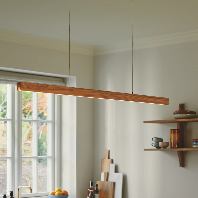 Ilgas hengelampe med lang skjerm i tre Ilgas pendellampe kjennetegnes av sin slanke, skandinaviske design og stramme estetikk. Et element av lyst tre er festet til den hvite baldakinen, og lampeskjermen, som inneholder varmhvite LED-lamper, består også av to smale treelementer som skjuler LED-stripen på innsiden. I spisestuen over bordet eller på kjøkkenet over en kjøkkenøy spotlighter Ilgas LED-spotlight et varmhvitt, behagelig lys gjennom LED-lampene bak et satinert deksel, som også kan dimmes ved hjelp av en passende veggdimmer.