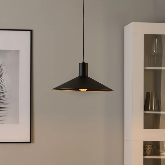 Svart Jump-pendel med bred, kjegleformet skjerm Jump-pendellampen i metall med elegant, matt svart finish imponerer med sin brede, kjegleformede skjerm. Ideell til bord- og områdebelysning.