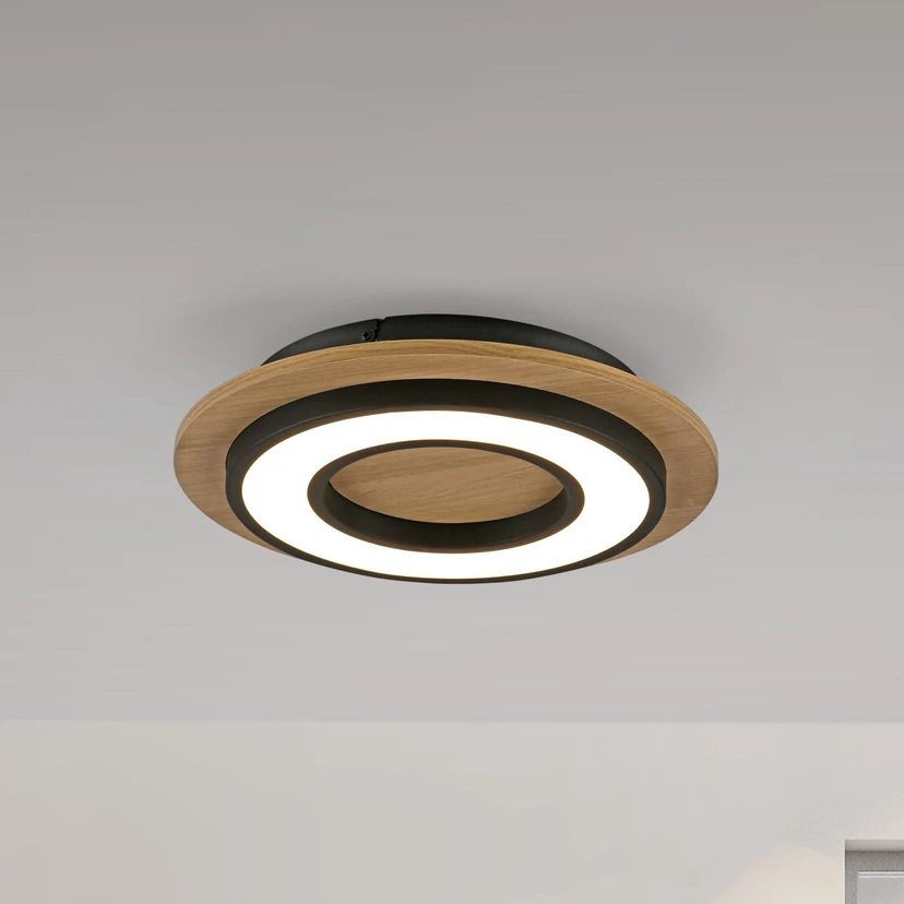 Tola rund taklampe med treplate og metallring En rund treplate og en svart metallring med et satengbelagt deksel på toppen - det er Tola taklampe. Ringen inneholder varmhvite LED-lamper som avgir et homogent lys nedover. Tola er en taklampe med LED-lamper som kan integreres i mange områder av hjemmet og som gir energieffektiv belysning.