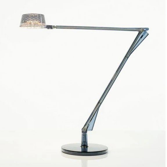 Dekorativ og funksjonell: Aledin Dec LED-skrivebordslampe Skrivebordslampen i Aledin Dec-serien fra Kartell kan justeres på flere punkter på rammen: på de to leddene på armene og på selve lampehodet. Dette kan vippes. Ingen steder langs aluminiumsarmene, som er dekket av plast, er det en kabel for strømtilførselen. Aluminiumslistene leder strøm og fungerer derfor som en erstatning for en kabel. Høyden på Aledin Dec kan justeres fra 48 cm til 113 cm. Designmessig er skrivebordslampen i moderne, puristisk stil. Dekor brukes sparsomt, men målrettet, for eksempel på den koniske skjermen, som er dekorert med fasetter. Aledin Dec LED-skrivebordslampe er en modell fra italienske Kartell. Det Milano-baserte selskapet er blitt kjent som en pioner når det gjelder møbler, lamper og hverdagsgjenstander i plast. I løpet av de siste sju tiårene har Kartell skapt designobjekter som ulike stoler, bord og lamper som allerede er klassikere i dag.