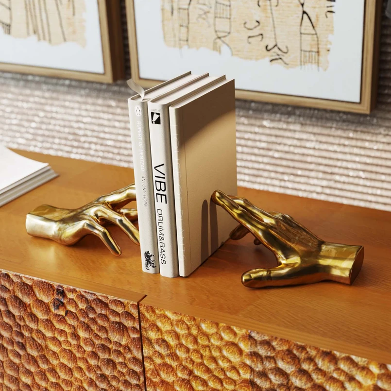 Holding Fingers-bokstøtte av foliert polyresin i et sett med 2 Denne todelte Holding Fingers-bokstøtten kommer best til sin rett i sin gylne farge. Bøker og annet vises frem på en stilfull måte. Bokstøttene er spesielt nyttige i hyller uten lukkede sidepaneler, men hendene kan også brukes til å organisere bøker på et skrivebord eller i vinduskarmen på en elegant måte.