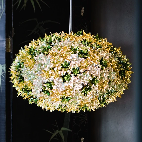 Bloom S1 designpendel av Ferruccio Laviani Flere lyskilder plassert på innsiden av lampeskjermen lyser opp de små blomstene med dobbel kronblad på utsiden og sprer lysrefleksjoner som multipliseres tusen ganger i rommet. Lampen, som er designet av den italienske designeren Ferruccio Laviani, er helt og holdent laget av polykarbonat og tilsvarer dermed varemerket til produsenten Kartell. Det italienske merket Kartell har siden 1949 laget lamper og andre møbler av plast, som er behandlet så effektivt og skånsomt som mulig. Høyeste kvalitet og høye teknologiske standarder står alltid i sentrum.