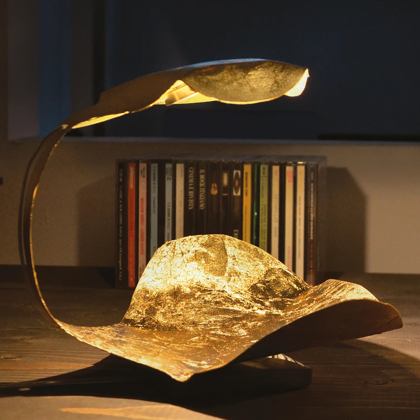 Edel designerbordlampe Gi.Gi med bladgullFancy design og edle overflater kjennetegner designerbordlampen Gi.Gi fra den italienske belysningsprodusenten Knikerboker. Hele lampekroppen består av stål som er formet og bearbeidet manuelt. Overflaten er dekket med bladgull, noe som ikke bare ser glamorøst ut, men også bidrar betydelig til bordlampens lyseffekt. Det fungerer ved at lyset fra LED-lampene i lampens øvre del reflekteres mot den nedre delen og reflekteres ut i rommet. Made in Italy er kvalitetsmerket som kjennetegner lampene fra Knikerboker og gjør dem spesielle, ikke bare når det gjelder design, men også når det gjelder kvalitet.