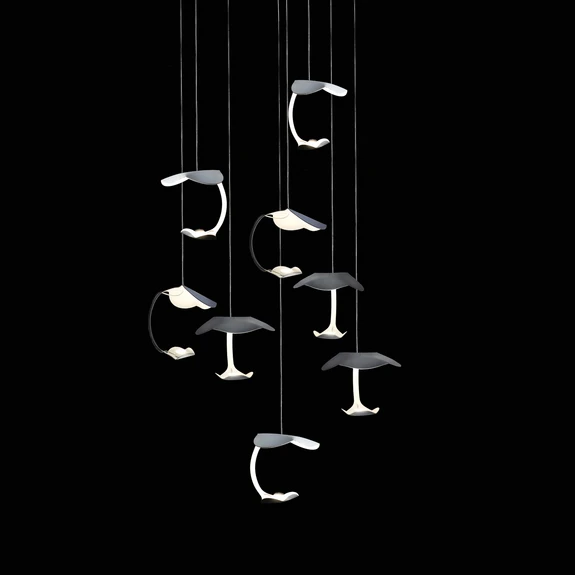 Dette hengende kunstobjektet inspirerer med sine flotte lyseffekter og den stemningsfulle belysningen som skapes av fargevalget og de åtte lyskildene. Åtte tau henger fra en rund, praktfull baldakin, hvorav fire er 200 cm lange og de fire andre 150 cm. Som et resultat er de åtte lyskildene festet i forskjellige høyder og posisjoner og får pendellyset til å fremstå spennende og individuelt.