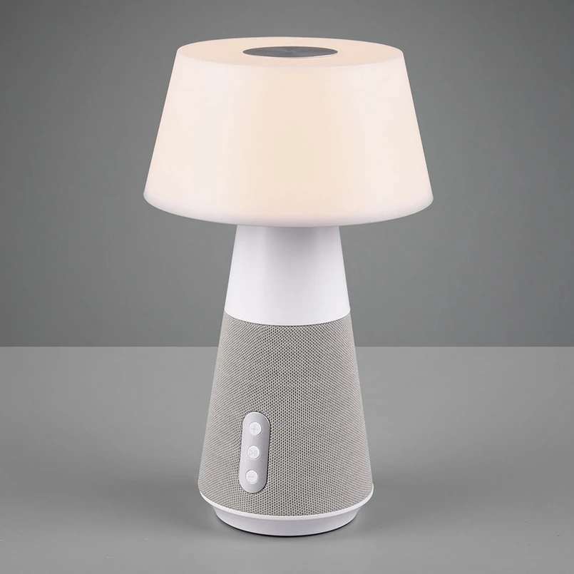 LED-bordlampe DJ med avtakbar Bluetooth-høyttaler Denne moderne LED-bordlampen DJ er laget av plast og avgir sitt varmhvite lys over hele den vakkert formede skjermen, som er helt hvit. Sokkelen går over i en høyttaler med tre knapper. Knappene kan brukes til å skru opp eller ned musikken eller til å velge neste sang. Musikken kan spilles av ved å koble høyttaleren til smarttelefonen via Bluetooth. Skjermen og sokkelen kan brukes uavhengig av hverandre, de skrus ganske enkelt sammen. På toppen av skjermen er det integrert en berøringsbryter som kan brukes til å dimme lyset (100 %, 50 %, 25 % og Av). Lysfargen kan også justeres i tre trinn - du kan velge mellom varmhvit, universalhvit eller dagslys. Takket være USB-tilkoblingen og den medfølgende kabelen er bordlampen enkel å koble til og lade. Driftstiden er opptil 40 timer, avhengig av innstilt lysstyrke.