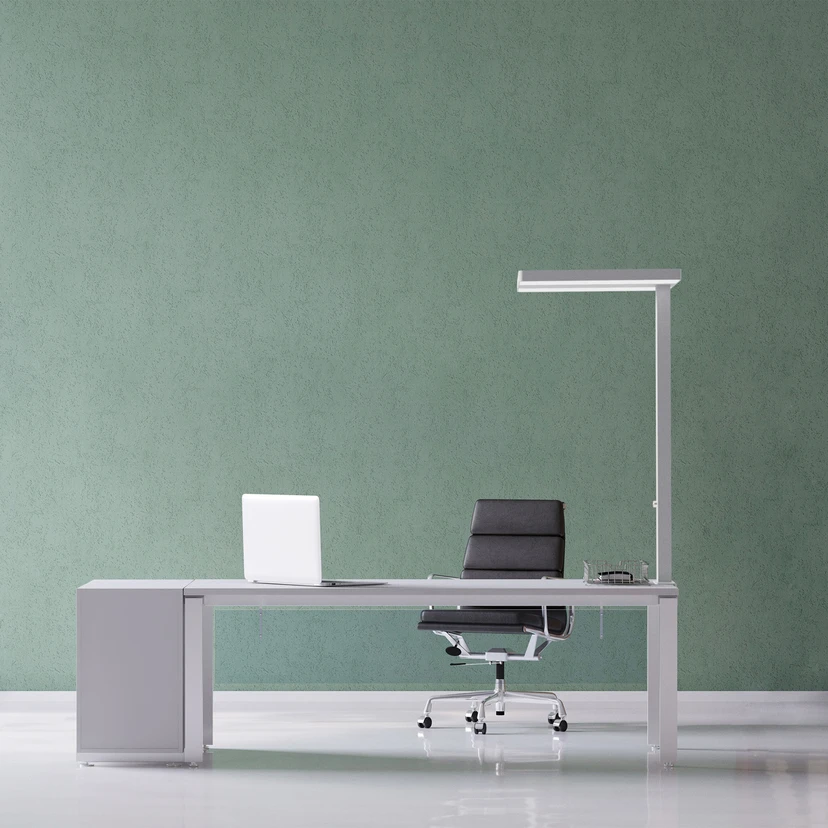 Dimbar MAULjaval LED-gulvlampe med klemmesokkel Den moderne MAULjaval LED-gulvlampen er ideell for høydejusterbare kontorpulter. Med sin robuste klemmefot kan den monteres direkte på bordplaten. Et filtbelegg på undersiden sørger for at overflaten beskyttes. Lyset fra den kraftige MAULjaval LED-kontorlampen sendes oppover som omgivelseslys og samtidig nedover som arbeidslys. En trinnløs dimmer sørger for optimal lysstyrke til enhver tid. LED-lampene spotlighter et universalhvitt lys som er ideelt for konsentrert arbeid - Direkte belysningsstyrke: 2520 lux på 85 cm avstand, 1560 lux på 110 cm avstand