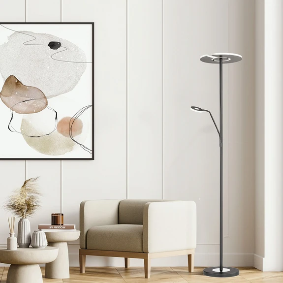 Dent LED-uplight: integrert CCT-funksjon for tilpassede lysstemninger Dent LED-uplight med lesearm er en berikelse for alle rom. Med sin moderne design i elegant svart føyer den seg sømløst inn i innredningen i stuen, arbeidsrommet eller spisestuen. Den integrerte CCT-funksjonen gjør det mulig å justere fargetemperaturen på lyset etter behov - fra varme toner som skaper en koselig atmosfære til kjøligere nyanser som fremmer konsentrasjon og produktivitet. Den integrerte LED-lyskilden utmerker seg med sin energieffektivitet og gir en langvarig belysningsløsning. Uplighten er utstyrt med en dimmer som gjør det mulig å regulere lysstyrken nøyaktig og dermed tilpasse lysforholdene optimalt til den aktuelle situasjonen. Den ekstra lesearmen på Dent uplight gir målrettet lys for øyeblikk der det kreves konsentrert arbeid eller avslappet lesing. Kombinasjonen av hovedlyskilde og leselampe gjør denne uplighten til et multifunksjonelt belysningselement som oppfyller både praktiske og estetiske krav.